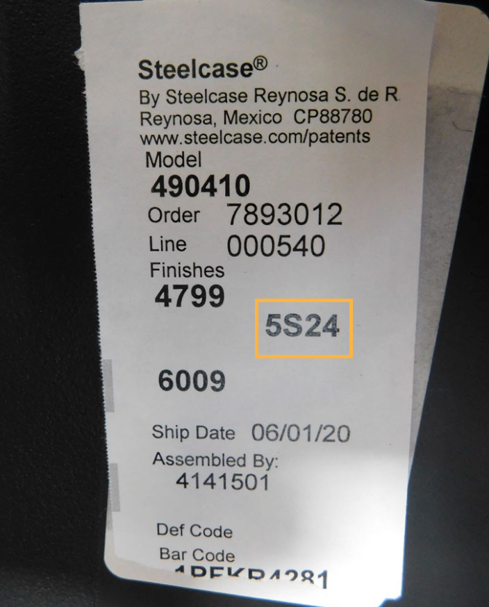 For Aeron, the warranty label is placed beneath the seat. The fabric SKU typically appears at the very end of a long manufacturing code. (Aeron fabric codes typically start with: 23- or 3D-)